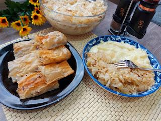 Napravite pitu sa kupusom. Koru nafiluje isprženim kupusom, savijte malo po dužini, pa premažite uljem i urolajte. Ređajte u podmazanu tepsiju. Pecite na 200°C oko 40 minuta.