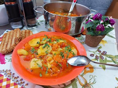 Luk isecite na rezance kao i papriku. Šargarepu i krompir na krugove. Paradajz ogulite, pa isecite na kocke. Izdinstajte luk, dodajte papriku, šargarepu i na kraju seckani beli luk. Začinite mlevenu crvenu papriku. Dinstajte još malo. Ubacite krompir i nalijte vode da ogrezne i kuvajte dok ne bude gotov. Dodajte paradajz i krčkajte još malo. Umutite 1 kašičicu kukuruznog skroba sa malo vode i dodajte u ćuspajz. Na kraju dodajte celerov list i peršun, suvi začin ili samo soli i malo bibera.