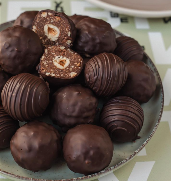 Istopite čokoladu, pa dodajte lešnik puter, med i mleko. Kuvajte dok se sve ne sjedini i postano polu tečno. U to dodajte mleveni keks i dobro promešajte. Uzimajte kašiku smese, rastanjite, stavite lešnik i oblikujte kuglicu. Smesa je malo lepljiva, ali može da se radi sa njom. Kuglice uvaljajte u seckani lesnik, zatim ih odložite u frizer na sat vremena. Istopite čokoladu na pari, dodajte kašiku ulja i promešajte. Umočite kuglice i ređajte ih na žicu da se stegnu. Ako se čokolada malo stegne, samo je zagrejem još jednom kratko. Kuglice odložite još jednom u frižider da se stegnu i spremne su za jelo.