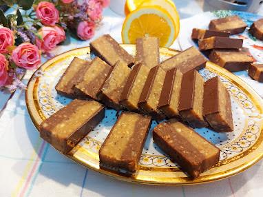 Izblendirajte keks i orah, pa sjedinite. Dodajte otopljen margarin, šećer u prahu i malo soka. Rukama dobro izjednačite. Podelite na pola. U jedan deo dodajte rastopljenu čokoladu, pa promešajte. Na manji poslužavnik stavite prvo čokoladni deo, pa lepo špatulom raširite. Preko stavite svetli deo, pa i njega rasporedite i poravnajte. Prelijte sa otopljenom čokoladom u koju ste dodali malo ulja. Ostavite da se dobro stegne u frižideru. Secite potpuno ohlađenu.
