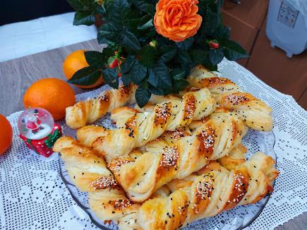 Opet razviti testo za oko pola cm. Premazati žumancetom celu razvijenom površinu. Seći trake 1,5 cm širine pa uviti i ređati u pleh. Posuti susamom i odmah peći na 220 stepeni oko 20-30 minuta.
