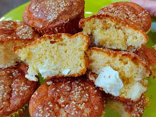 Umutiti jaja, dodati kukuruzno brašno izmešano sa praškom ua pecivo. Posoliti, dodati kocku sira, jogurt, pavlaku, ulje i sve dobro sjediniti. Pleh za mafine puniti do pola. Dodati u svaki po 2-4 kockice sira pa odozgo rasporediti ostatak testa. Posuti susamom. Peći na 200 stepeni dok ne porumeni. Proveriti čačkalicom da li je gotovo.