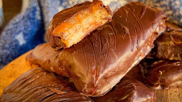 Veoma brzo i lako napravite zdraviju i dijetalniju verziju popularne Twix čokoladice. Umesto javorovog sirupa, možete da koristite samo med. Umesto badema ili ovsenog brašna možete da koristite mleveni keks.