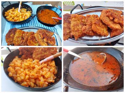 Za to vreme krompir skuvati, oguliti pa iseći na kocke. Luk iseckati, propržiti pa dodati crvenu mlevenu papriku. Dodati odmah krompir, mleveni biber i so. Sve izmešati.