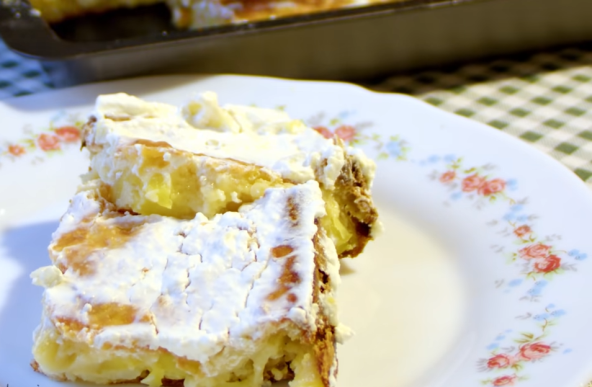 Iseckajte luk i krompir na kockice, umutite jaja pa dodajte ulje, jogurt, vodu, začine, brašno. Sve izmešajte pa sipajte u podmazan pleh. Pečeno i vruće isecite na kocke i premažite pavlakom ili kiselim mlekom. Pospite belim lukom. Ovo jelo možete obogatiti sitnim sirom ili iseckanim kobasicama, pršutom...Peče se u zagrejanoj rerni na 220 stepeni oko 35 minuta.