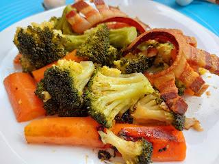Ispržiti listove slanine sa malo ulja pa kad zarumene izvaditi i tu dodati beli luk na pola sečen pa zatim brokoli na cvetiće i šargarepu na komade. Dodati 50 ml vode smanjiti i poklopiti. Dinstati oko 10 minuta da voda ispari i malo se zapeče brokoli i šargarepa.