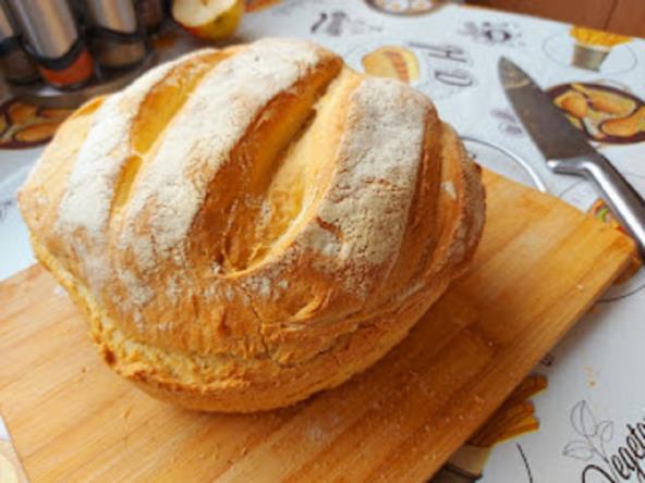 U toplu vodu dodajte kvasac i šećer, lepo promešajte i ostavite da se aktivira. Zatim dodajte ulje, brašno i so. Prvo dodajte 700 g brašna, pa postepeno ostatak, jer treba da zamesite srednje tvrdo testo. Pokrijte i ostavite da odmori. Na pobrašnjenoj površini još malo obradite testo i stavite u okrugli pleh koji ste obložili pek papirom. Popsrskajte mlakom vodom i pospite brašnom testo. Nožem zasecite na tri mesta trake i pokrijte, pa ostavite još 15 minuta. Pecite u zagrejanoj rerni na 220°C oko 45-50 minuta.