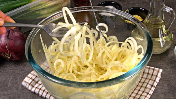 Luk isecite na kolutove, pa stavite u činiju i začinite. Dobro promešajte i servirajte.