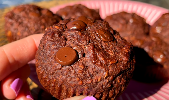 Ovsene pahuljice i badem usitnite u blenderu, pa dodajte banane, kakao, prašak za pecivo, med, mleko i kikiriki puter. Dobro izblendirajte. U kalup za mafine stavite papirne kalupe, pa sipajte smesu. Ako želite stavite čokoladne mrvice i pecite u zagrejanoj rerni na 180°C oko 30 minuta.