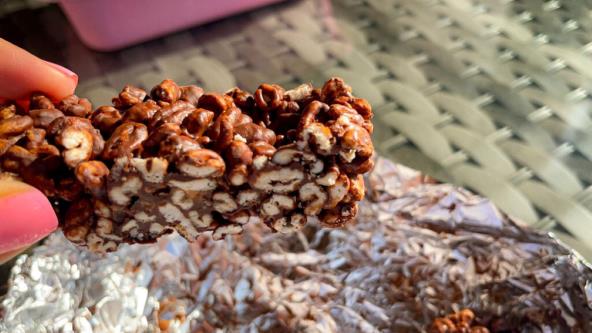 Otopite na pari čokoladu, kikiriki puter i kokosovo ulje. U istopljenu čokoladu sipajte ekspandiranu speltine ili prinač. Dobor promešajte. Kalup obložite aluminijumskom folijom, pa sipajte smesu. Ravnomerno je rasporedite i ostavite u frižideru da se čokolada stegne i ohladi.