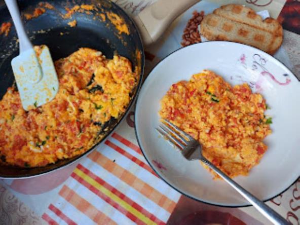Paradajz oguliti pa ga iseckati na kocke. Ugrejati malo ulja pa istresti u tiganj paradajz, dodati beli luk i posoliti. Pokriti da i pržiti da ispari tečnost. Dodati izdrobljen sir pa kad se istopi dodati umućena posoljena jaja.Poklopiti i pržiti minut dva i promešati.