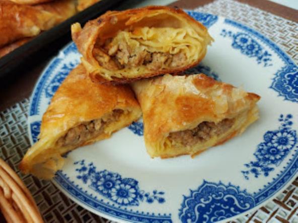 Na ulju izdinstati glavicu sitno seckanog crnog luka, kad bude staklast, dodati mleveno meso da se dinsta. Dodati so, biber, malo mlevene paprike. Skinuti sa vatre. U činiji umutiti pavlaku i jaja, dodati malo ulja i jogurt i sve izjednačiti. Jedan list kore premazati sa 2-3 kašike nadeva pa je preklopiti na pola. Malo premazati uljem odozgo pa na jedan kraj staviti kašiku mesa. Preklopiti opet na pola i opet premazati uljem i preklapati u trougliće. Ređati u pleh, premazati uljem i peći na 200 stepeni oko 30-40 min.