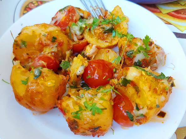 Luk iseckani pa propržiti. Dodati beli luk,ajvar, papriku, biber, muskatni oraščić, začin, kurkumu. Ubaciti kuvan krompir sečen po želji, paradajz i promešati. Poklopiti i malo pržiti. Dodati rendan kačkavalj i peršunov list. Poklopiti da se kačkavalj istopi. Služiti toplo.
