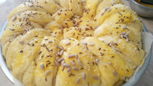 U malo mlakog mleka rastvoriti kvasac sa kašikom šećera. Dodati jaja, ulje, zatim ostatak mleka, brašno i so pa zamesiti srednje tvrdo testo. Ostaviti u vanglici da malo poraste pa ga razviti. Premazati omekšalim puterom. Urolati. Seći rolate i ređati u podmazan pleh. U sredinu stavite koji oblik želite. Ostavite pogaču da malo naraste namažite žumancetom i pospite susamom. Peći na 200 stepeni 45 min. Možete na polovini pečenja smanjiti na 180 stepeni.