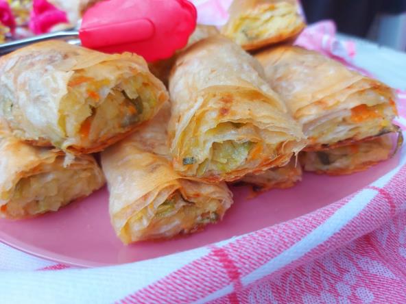 Luk iseći na krugove i propržiti 2-3 minuta. Staviti so, začin i biber. Krompir i šargarepu izrendati pa pržen luk sipati na krompir i rukama izjednačiti. Koru premazati uljem, pa staviti drugu preko nje. Uzeti jednom rukom fil i rasporediti po kori, kao i na ivice. Saviti ivice i uviti. Ređati u podmazan pleh. Kad sve utrošite kore premazati i iseći na manje rolate. Peći na 200 stepeni C oko 40-45 minuta. Kad porumeni izvaditi i služiti toplu.