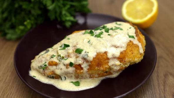 Pileća prsa posolite i pobiberite. Potom ih umočite prvo u brašno pa u mešavinu jaja i parmezana. U tiganju zagrejte ulje i puter. Pržite pileća prsa na laganoj vatri 7-8 minuta sa svake strane dok ne porumene. Meso izvadite, a u istom tiganju propržite seckan beli luk. Sipajte belo vino, pavlaku za kuvanje, dodajte seckan svež peršun, so, biber pa promešajte. Vratite meso i krčkajte još 10 minuta zajedno sa kriškama limuna.