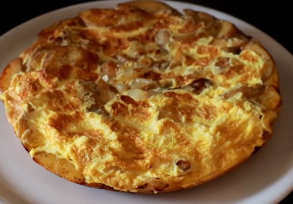 Propržite seckani crni luk i dodajte smrznuti već isečeni krompir. Par minuta pržite, pa prelijte umućenim jajima. Poklopite i propržite sa obe strane, a zatim servirajte.