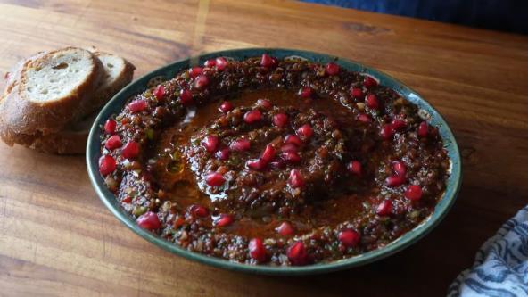 Sitno iseckajte paradajz i crni luk. Očistite papričice i papriku od semenki, pa ih zajedno s belim lukom i peršunom veoma sitno iseckajte. Sve naseckane sastojke prebacite u veliku činiju. Dodajte pul biber, sumak, suvu nanu, kumin i so. Dodajte sirup od nara i maslinovo ulje, pa lagano promešajte da se sve sjedini. Prebacite u tanjir za serviranje i po želji ukrasite zrncima nara.