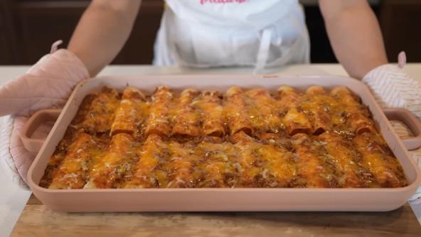 Zagrejati ulje na srednjoj vatri, pa propržiti svaku od tortilja 5 sekundi. Kockicu supe pomešajte sa vrelom vodom, pa u bujon ubacite pastu paradajz sosa, čili u prahu i slatku začinsku papriku i dobro promešajte. Zagrejte malo ulja na tiganju, pa dodajte iseckan crni luk. Dinstajte par minuta, pa dodajte usitnjen beli luk. Dinstajte još 30 sekundi, pa dodajte mlevenu govedinu, mleveni kim, origano, biber, promešajte dobro i krčkajte oko 7 minuta, dok meso ne bude gotovo. Meso gurnite u stranu, tako da u sredinu ostane sok i u njega ubacite brašno. Malo promešajte, pa sjedine sa mesom. Uspite bujon sa čili paprikom u tiganj, pa ponovo dobro promešajte. Kada smesa proključa, smanjite temperaturu i ostavite da se krčka 10 minuta, odnosno dok se ne zgusne. Izlijte polovinu sosa po plehu. Iseckajte crni luk i izrendajte sir, pa njima napunite tortilje. Ređajte ih po plehu, pa prelijte ostatkom sosa. Pospite sa rendanim sirom i lukom koji vam je preostao i pecite na 350°C oko 10 minuta.