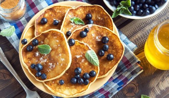 3. Pecite palačinke na srednje jakoj vatri dok se sa svake strane ne zarumene. Poslužite ih s medom, kriškama sveže pomorandže i borovnicama.