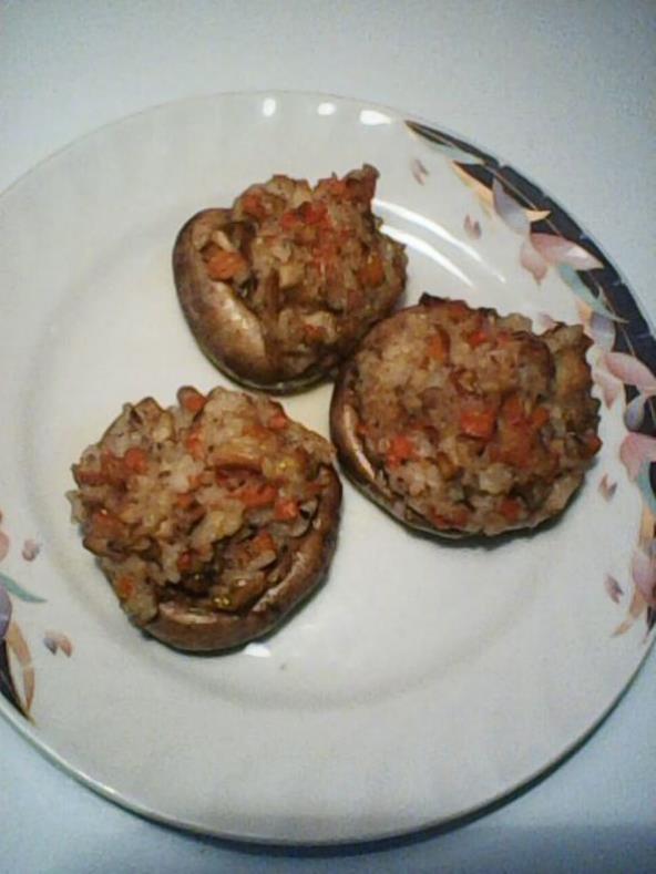 Pirinač obarite u slanoj vodi. Šampinjonima uklonite drške koje ćete sitno naseckati, a klobuke ostavite za punjenje. Naseckajte praziluk i šargarepu pa ih prodinstajte, dodajte im naseckane pečurke, poklopite i dinstajte dok šargarepa ne omekša. Nakon toga dodajte obareni pirinač. Posolite i pobiberite po ukusu, dodajte origano i granule belog luka. Pripremljenim nadevom napunite klobuke pečurki i poređajte u nauljenu tepsiju.