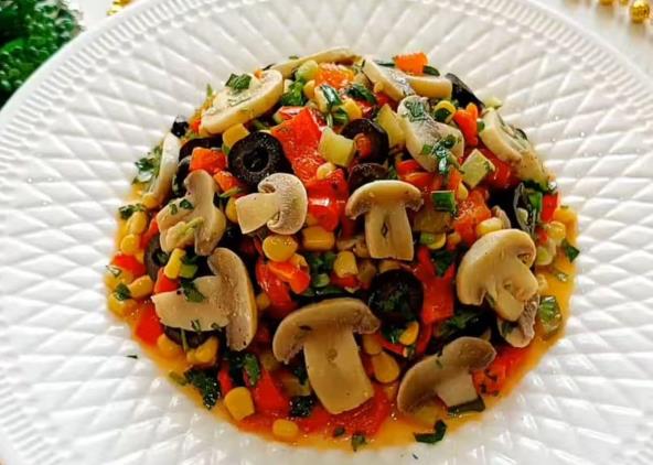 U šerpu sipajte vodu i malo limunovog soka, pa stavite pečurke koje ste isekli. Zatim isecite kiseli krastavac, mladi luk, peršun i masline. Paprike ispecite u rerni ili korisitite već pečene ako imate. Očistite ih i isecite. Kukuruz procedite i pomešajte sve sastojke u posudi. Pomešajte ulje i limunov sok koji ste posolili i pobiberili. Prelijte preko povrća i dobro promešajte.