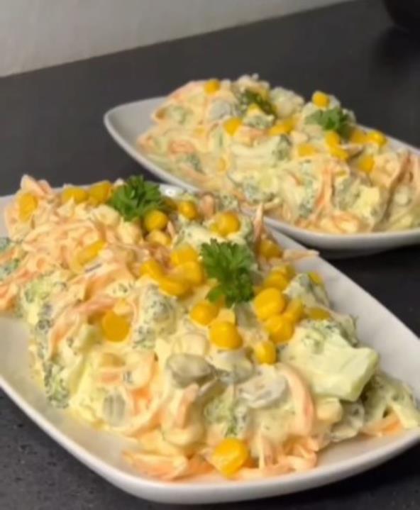 Isecite brokoli na cvetove, dobro ih operite i kratko blanširajte u vodi, nekih 5 minuta. Zatim vodu procedite i nakon ispiranja hladnom vodom ostavite da se ohladi. Rendanu šargarepu stavite u zagrejan tiganj i dinstajte dok ne omekša. Kada se i šargarepa ohladi pomešajte u posudi brokoli, šargarepu, kukuruz, seckane kisele krastavce. Malo seckane mirođije ili peršuna pomešajte sa rendanim belim lukom, jogurtom, majonezom i senfom. Dobro promešajte i prelijte salatu.