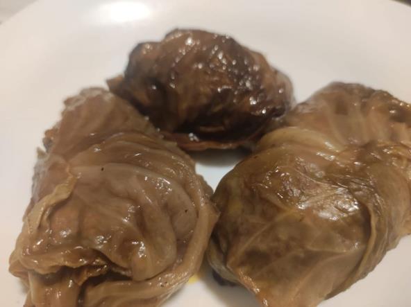 Crni luk i praziluk sitno iseckajte, pa propržite na ulju. Kada omekša dodajte i seckanu šargarepu. Posolite. Zatim dodajte i opran pirinač i dobro promešajte. Nakon par minuta dodajte i mlevene orahe, pa pospite suvim začinom i biberom. Dobro promešajte i sklonite sa šporeta. Dodajte cepkani losos i opet dobro sjedinite. Kiseli kupus očistite, operite i držite u mlakoj vodi nekih pola sata, pa punite liske i rolajte. Ređajte u nauljenu tepsiju i sipajte preliv koje ste napravili tako što ste pomešali mleveni beli luk, vodu i slatku papriku. Pecite na 200°C oko pola sata.