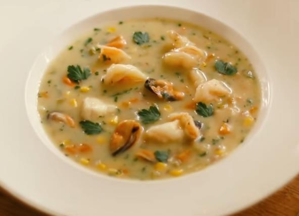 U šerpi istopite margarin, pa propržite sitno seckani crni luk, a kada on omekša dodajte sitno seckanu šargarepu i celer. Dodajte timijan, semenke komorača i lovorov list, pa pržite nekih 10 minuta dok povrće ne omekša. Dodajte mleveni beli luk i dinstajte još 5 minuta. Zatim pospite brašno, dobro promešajte i pržite još pet minuta. Sipajte belo vino i riblji bujon (u 1,5 l vrele vode razblažite riblju kocku za supu). Dobro promešajte, poklopite i kuvajte još 20 minuta. Dodajte kukuruz, pavlaku za kuvanje i rednadnu koricu limuna. Sipajte morske plodove i seckani file u šerpu, promešajte, poklopite i kuvajte još 10-15 minuta. Neposredno pre serviranja dodajte seckani peršun i dobro promešajte.