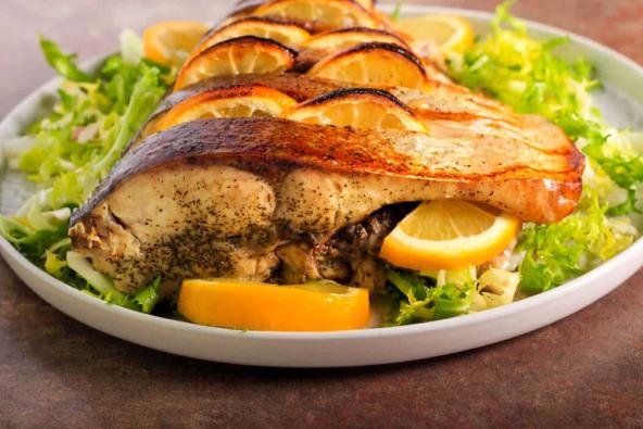Skinite kožu ribe i isecite kotlete. Posolite i pobiberite, pa u vatrostalnu posudu poređajte isekcani luk, šargarepu, celer i papriku. Opet posolite i poređajte kotlete ribe preko. Pokrijte aluminijumskom folijom i pecite u zagrejanoj rerni na 180°C oko 40 minuta.