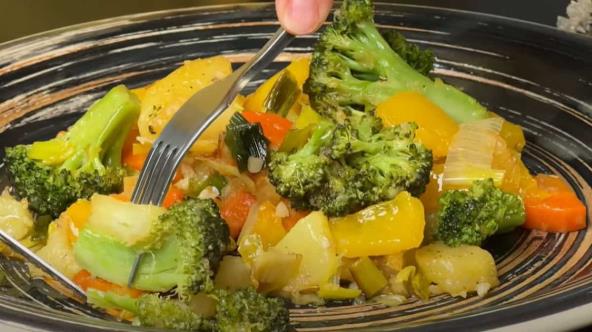 U posudi pomešajte seckanu šargarepu, brokoli, papriku i praziluk. Prelijte uljem, pa pospite skrobom koji ste pomešali sa kimom i dimljenom paprikom. Dobro promešajte. U tiganju zagrejte ulje, pa propržite sitno seckani krompir. Posolite i pobiberite krompir, pa dodajte povrće i promešajte. Poklopite i krčkajte, a pred kraj dodajte i mleveni beli luk. Posni ručaksa povrćem je gotov.
