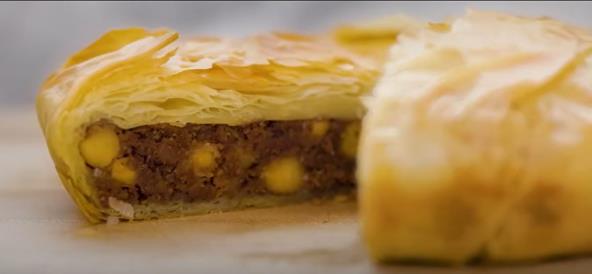 Orahe ubacitite u bledner, pa dodajte začine, sekcani beli luk, sušeni paradajz i sve dobro izblendirajte. Leblebije procedite, pa operite i opet procedite. Zatim u blender dodajte leblebije (300 g) i seckani crni luk. Sve dobro izblendirajte, pa propržite u tiganju u koji ste sipali 3 kašike maslinovog ulja. Zatim dodajte cele leblebije (240 g) i promešajte, pa sipajte 3-4 kašike vode. Poklopite i ostavite na šporetu dok tečnost ne ispari, tj. još par minuta. Stavite koru u tepsiju (tako da vidi iz nje), pre premažite uljem. Tako poređajte svih 10 kora, a svaku premažite uljem. Sipajte nadev, pa zatvarajte korama koje vire. Takođe svaku premažite uljem. Pecite u zagrejanoj rerni na 180°C oko 30 minuta.