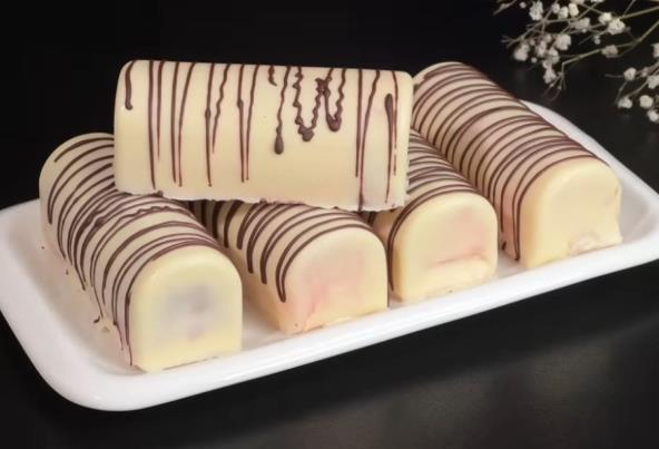 U silikonski kalup sipajte umućeni želatin, pa preko sipajte fil sa jagodama. Zatim ide još jedan sloj umućenog želatina, pa stavite oblandu koju ste isekli u obliku kolača i pritisnite. Ostavite da se ohladi u zamrzivaču, pa izvadite iz kalupa i ukrasite istopljenom čokoladom.