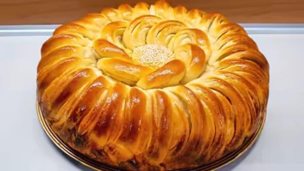 Jedan veći deo testa razvucite u tanji krug i premažite puterom. Urolajte ga u rolnu, pa isecite na komadiće i poređajte u okrugli pleh obložen papirom za pečenje, počevši od spoljne strane. Isto nastavite sa preostalim većim loptama testa tako što ćete ih razviti oklagijom, premazati urolati u rolnu pa iseći na manje komade poput kolača i ređati u unutrašnjost nepopounjenog dela pleha.