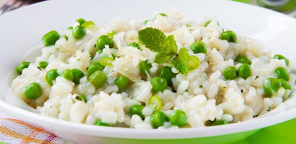 Povrtni bujon držite u šerpi na veoma laganoj vatri da se zagreje. U rižoto dodajte kutlaču po kutlaču, mešajući sve vreme da se upije. Kada je pirinač kuvan dodajte smrznuti grašak i kuvajte još nekoliko minuta. Umešajte limunovu koricu i sok, malo začina i pospite peršunom. Uživajte. Možda ćete želeti da napravite i jeftini rižoto sa paprikama i piletinom.