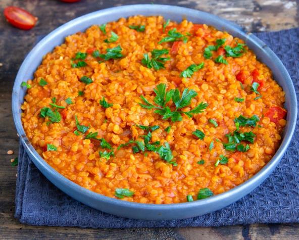 Zatim dodajte balzamiko sirće, dimljenu papriku, kim, biber sočivo. Dobro mešajte. Dodajte povrtni bujon, posolite i pobiberite. Promešajte i pustite da proključa. Pokrijte šerpu do pola poklopcem i ostavite da se krčka oko 10 minuta. Umešajte sok od limuna. Paprikaš servirajte vruć, sa seckanim svežim začinskim biljem i dodatnim limunom. Možda ćete želeti da napravite i posnu salatu sa makaronama.