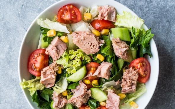 Kako biste napravili tuna salatu, listove zelene salate isecite na manje komade. Krastavce i paradajz isecite na kriške. Ubacite ih u posudu. Tunjevinu malo izgnječite viljuškom, ocedite tečnost. Ubacite kuvana zrna kukuruza i sve promešajte.