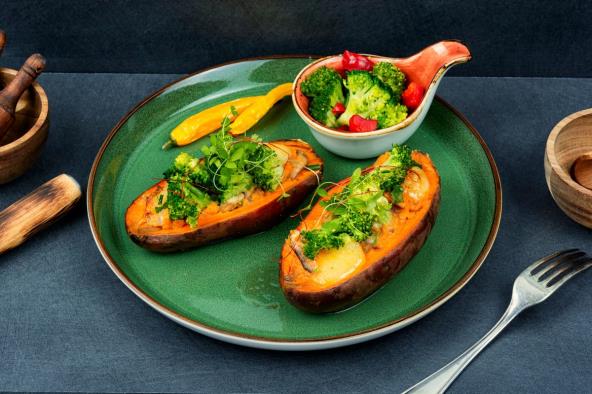 Dok se povrće peče, naseckajte mladi luk i čeri paradajz i pomešajte ih. Pečeni krompir isecite po dužini, ali ne do kraja i izvadite deo unutrašnjosti pa ubacite pečeno povrće, a odozgo ukrasite mladim lukom i paradajzom. Uživajte! Možda ćete želeti da napravite i filovane posne krompire.