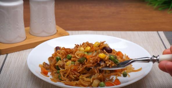 Kako biste napravili rezance sa povrćem u tiganj sipajte oko 1 kašiku ulja i dodajte 200 g malih rezanaca. Stalno mešajte i pržite na laganoj vatri oko 10 minuta, dok ne dobiju zlatnu boju. Pripremljene rezance prelijte vrelom vodom tako da ih potpuno prekrije.