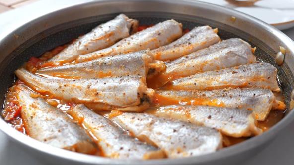 Poređajte ribu u tiganj, sipajte vodu, dodajte lovor pa poklopite i dinstajte na laganoj vatri, dok se ukusi ne sjedine i riba ne bude gotova.