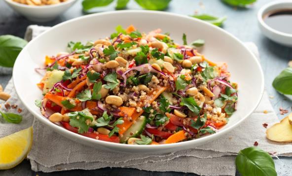 Kako biste napravili ovu salatu, pomešajte u činiji za serviranje proso, kikiriki, šargarepe, paprike i sveži peršun.