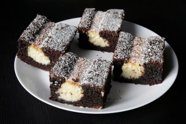 Smesu podelite na dva dela, pa u jedan deo dodajte kašiku kakaoa. Po potrebi dodajte još gazirane vode, dok ne dobijete glatku smesu. Nakon toga u kalup za kolače naizmenično stavljajte belu i crnu smesu.