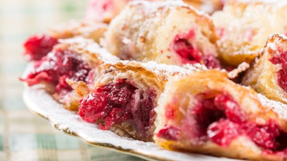 Na četvrtu koru dodajte vanilin šećer i rasporedite višnje. Pospite prezlama i još jednom kašikom šećera. Zatim sve kore pažljivo umotajte u rolat.