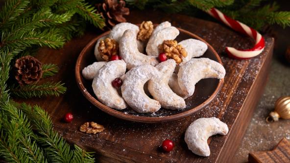 Za božićne praznike, ove kolačiće možete oblikovati u klasične polumesece ili koristiti metalne modle, što olakšava razlikovanje ukusa i daje još praznični izgled trpezi. Mekani, blago hrskavi i aromatični, idealni su uz čaj ili kafu, a ujedno su jednostavni za pripremu i dekoraciju.