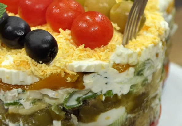 Patlidžan i papriku isecite na kockice, a crni, praziluk i beli luk sitno iseckajte. Sir i jaja isecite na kolutove. Pomešajte jogurt i majonez, pa dodajte 1 čen presovanog belog luka. Posolite po ukusu, sipajte limunov sok i iseckajte peršun. Dobro promešajte. U kalup prvo stavite pečene paprike, zatim patlidžan, onda idu crni i beli luk i praziluk, pa sloj sosa. Onda idu jaja, paprike, patlidžan, sve 3 vrste luka i malo posolite. Premažite jogurtom, pa poslednji sloj paprika i preko njih mocarela. Ostavite u frižideru najmanje 4 sata. Pospite rendanim žumancetom i ukrasite čeri paradajzom.