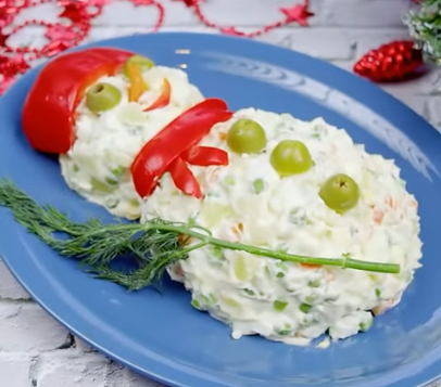 Krompir i šargarepu isecite na male kocke. Krompir, šargarepu i grašak kuvajte na pari oko 20 minuta. Poslite i sipajte malo maslinovog ulja. Dodajte jaja sitno seckana i majonez. Dve dobro sjedinite. Napunite 2 posude, manju i veću, pa okrenite na tanjir jednu ispod druge. Treba da formirate sneška. Ukrasite biberom, šargarepom, maslinama i mirođijom kao što je prikazano na snimku.