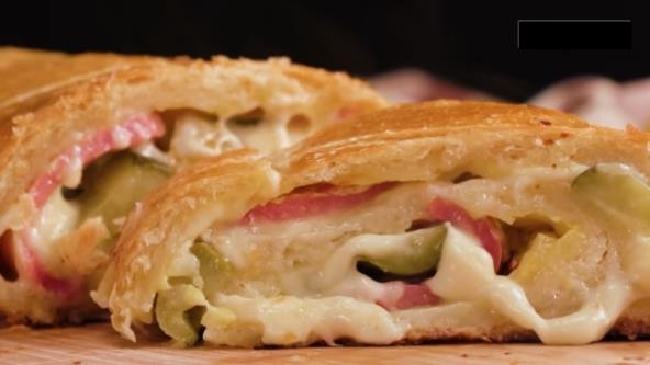 Lisnasto testo nafilujte sirom, šunkom i krastavčićicama, pa urolajte. Kada se ispeče izgleda kao hleb, ali kada isečete parčiće možete da poslužite neverovatno ukusno predjelo za koje vam treba manje od pola sata. Pored ovih ukusnih zalogaja poslužite i neku kremastu salatu.