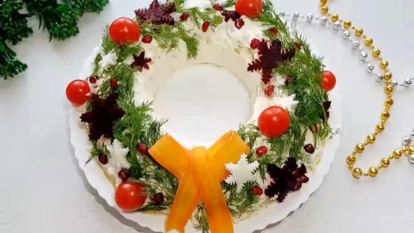 Ako kod kuće organizujete proslavu za Novu godinu onda pripremite neka od najleših jela i grickalica. Salata novogodišnji venac je neprevaziđeno predjelo za najluđu noć, a glavni sastojci su krompir, jaja, meso, orasi, majonez...Pomoću čaše ćete napraviti ovako lep oblik, a ukrašanjavanje je zaista lako. Stavite je na sredinu svečane trpeze, a oko venca poređajte jelke, sneška i ostala novogodišnja predjela i slatkiše.