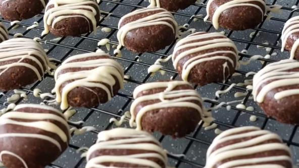 Sitni kolačisu ukras svake praznične trpeze, a naš predlog su ovi preslatki i preukusni. Sve što treba da uraditejeste da pomešate sastojke, oblikujte loptice i ostavite u zamrzivaču. Na kraju se ukrašava belom čokoladom i to je cela procedura. Nikad lakše hnapravite divne novogodišnje sitne kolače koji će nestati iz činije čim ih poslužite. Ako želite posnu varijantu koristite posni keks, posni margarin i posnu čokoladu.