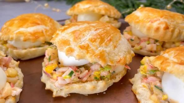 Na lisnatom testu isecite 6 krugova pomoću kalupa. Ako imate reckavi kalup, biće još bolje. Savijte testo kao na slici kako bi oblikovali školjku. Nožem zasecite kao na slici. Poređajte na pleh obložen pek papirom, pa premažite umućenim jajetom. Pecite na 200°C nekih 8-10 minuta. Za to vreme isecite krompir na sitne kocice i skuvajte, pa procedite. Ako koristite surimi štapiće, prvo ih par minuta propržite na malo ulja, pa iseckajte, a ako koristite dimljeni losos samo ga iseckajte. Pomešajte, pa dodajte kukuruz, sitno seckani crni luk, seckanu zelenu salatu, vlašac, majonez, kečap i maslinovo ulje. Posolite i pobiberite. Dobro promešajte. Testo presecite na pola, ali ne do kraja, pa napunite filom, a onda stavite jaje koje ste prethodno skuvali i isekli na četvrtine.